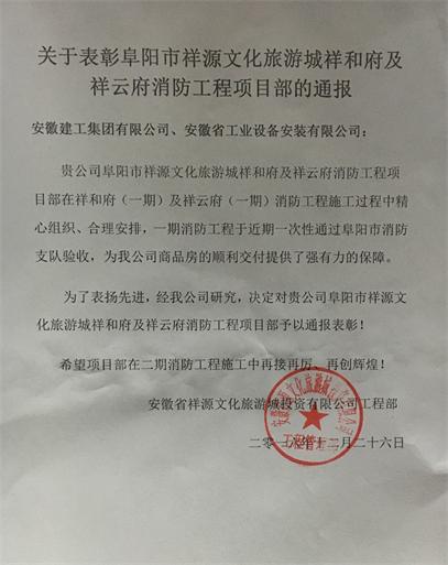 12月26日,阜陽市祥源文化旅游城業(yè)主單位安徽祥源文化旅游城投資有限公司發(fā)來通報(bào),就公司第四分公司阜陽市祥源文旅城消防工程項(xiàng)目部在一期工程施工中的突出表現(xiàn)給予表彰!