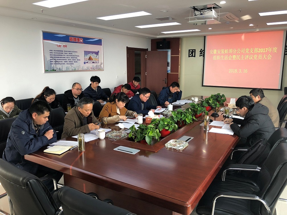 3月16日下午,蚌埠分公司黨支部召開了2017年度專題組織生活會暨民主評議黨員大會,會議由分公司黨支部書記洪軍主持。公司副總經理劉安俊、公司黨委辦公室楊俊輝以及分公司全體黨員參加會議。