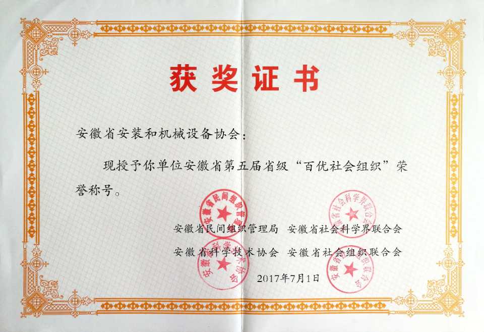 2017年7月,安徽省安裝和機械設備協會第三次榮獲安徽省第五屆省級“百優社會組織”稱號,并由安徽省民間組織管理局、安徽省社會科學界聯合會、安徽省科學技術協會、安徽省社會組織聯合會聯合頒發了榮譽證書。