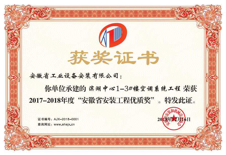 根據(jù)《中國安裝工程優(yōu)質獎(中國安裝之星)評選辦法》(安協(xié)〔2015〕19號)、《關于開展“2017-2018 年度中國安裝工程優(yōu)質獎(中國安裝之星)第一批評選活動”的通知》(安協(xié)〔2017〕7 號)要求,協(xié)會做為我省推薦單位,組織專家對七個申報中國安裝工程優(yōu)質獎項目,進行檢查驗收,一致認為,均代表我省安裝行業(yè)優(yōu)質水平。為表彰先進,樹立標桿,經(jīng)研究決定授予安徽省工業(yè)設備安裝有限公司“濱湖中心1-3#樓空調(diào)系統(tǒng)工程”等七項工程榮獲2017-2018年度“安徽省安裝工程優(yōu)質獎”。并在協(xié)會第七屆三次理事(擴大)會議上通報表彰。協(xié)會希望各獲獎單位珍惜榮譽,再接再厲,繼續(xù)探索爭先創(chuàng)優(yōu)的經(jīng)驗,充分發(fā)揮示范引領作用,各協(xié)會會員單位要以獲獎單位為榜樣,牢固樹立質量第一意識,多出精品,多創(chuàng)名品,為質量強省,提質優(yōu)效,轉型升級發(fā)展而努力。