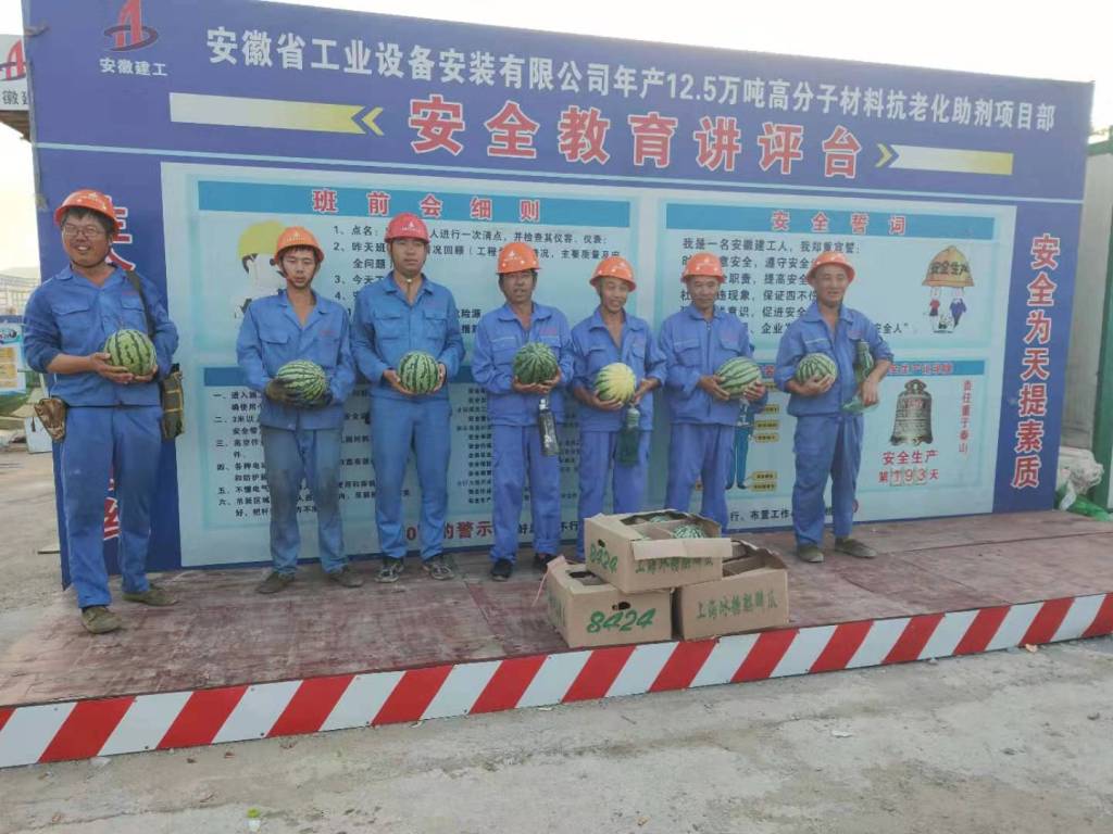 副總經(jīng)理王軍十分重視現(xiàn)場(chǎng)一線人員防暑降溫和工人的保障工作,多次電話詢問現(xiàn)場(chǎng)防暑降溫工作,項(xiàng)目部管理人員帶著公司領(lǐng)導(dǎo)對(duì)項(xiàng)目部工人們身體健康和安全生產(chǎn)的殷切期盼,把防暑降溫物品親自送到工人手里。一個(gè)個(gè)西瓜、一瓶瓶純凈水、一句句問候,表達(dá)了公司關(guān)心員工、體恤員工的一片情意,給炎炎夏日帶來(lái)一縷清涼。