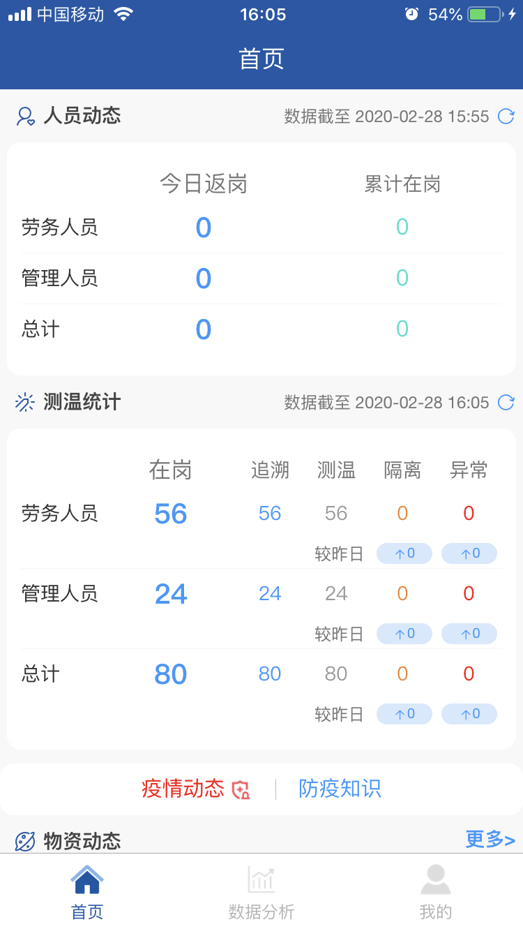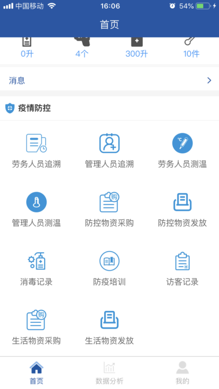 項目全面推行“返崗復工疫情防控系統”APP。主頁面包括勞務人員追溯、勞務人員測溫、防控物資采購、消毒記錄、疫情培訓等11個專題版面,通過這些功能可線上及時填報人員返崗日期、體溫、癥狀及是否為留守人員等詳細信息,還有項目部的疫情物資采購情況、環境衛生的消殺情況等相關信息,使上線人員時時了解疫情防控動態,充分借助信息技術手段,全力打贏疫情防控“戰役”。 借助這一平臺確保項目部實時、準確、有效地掌握現場人員的健康情況,助力疫情防控工作。