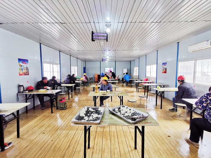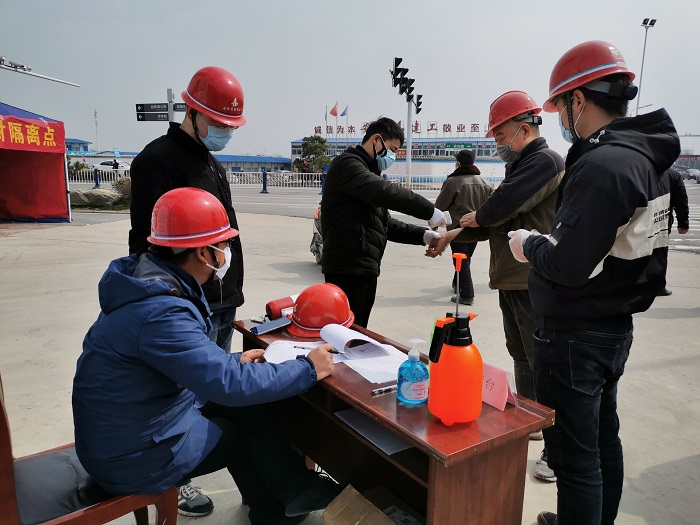 看得見的防疫配備,還有落在實處的防疫舉措。項目部開展員工返崗前14天健康在線管理,每位員工每日體溫、身體狀況、居住地、活動軌跡等信息,每天線上打卡、全員覆蓋。實行“生產網格化、吃住軍事化”,員工入“格”后,現場、宿舍、食堂“三點一線”管理,餐廳座位隔單排、菜飯統一打、就餐時間拉長,衛生區域增加管理人員,人員分類管理,將返崗復工人員控制在最小單元,確保安全。同時,生產流程重組,按項目緩急逐步恢復生產。
