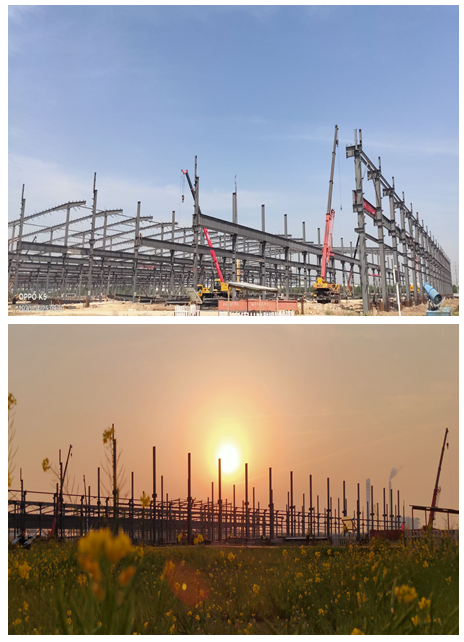 為進一步調動參建人員的積極性和創造性,分公司組織開展項目“大干90天”勞動競賽,有效形成了一片“比、學、趕、幫、超”的火熱生產局面。盡管3月底持續陰雨天氣,但絲毫沒有影響到月施工進度,2#車間整體框架已全部按時間節點圓滿完成。目前,1#車間安裝正在高速推進。