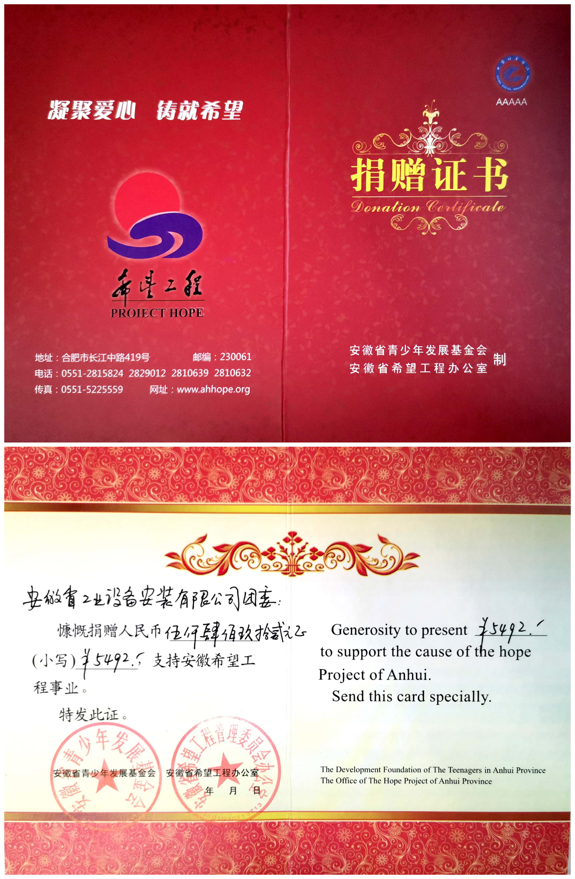 安徽安裝公司團委向安徽省青少年發展基金會捐款