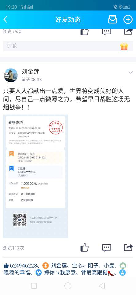 2020213日,劉金蓮同志通過微信轉賬的方式轉給甘肅省臨澤縣紅十字會捐款人民幣1000元,然后她又主動聯系當地紅十字會工作人員要求擔當志愿者,但是因為客觀原因未被批準。