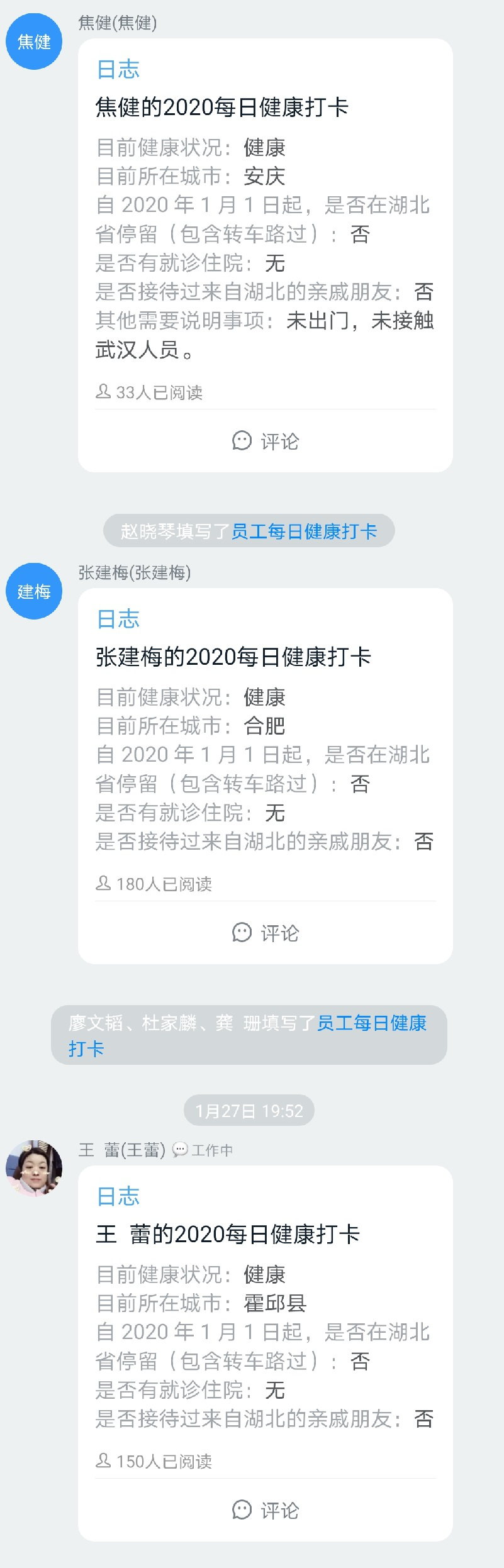 “千萬不要忘記在釘釘日志健康打卡!”