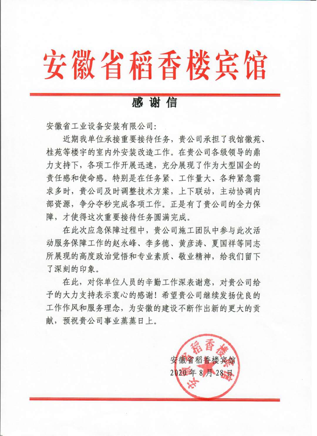 安徽安裝公司收到稻香樓賓館感謝信