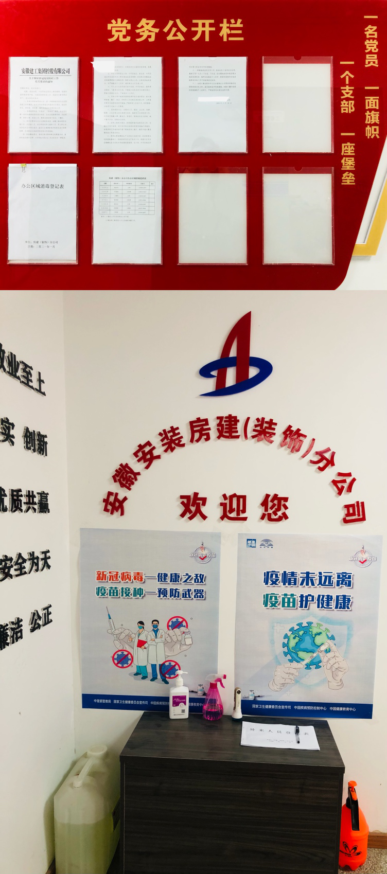 近期,安徽安裝房建(裝飾)分公司黨支部迅速落實集團公司黨委和公司黨委疫情防控有關工作部署,針對分司機關及所屬各項目疫情防控工作作出具體要求:一是要分公司機關、各項目部針對來訪人員及時做好測溫、登記工作;二是要加強辦公區(qū)、項目食堂等人員易集中區(qū)域的日常衛(wèi)生消殺工作;三是要積極做好疫苗接種宣傳工作,合理安排組織職工就近接種疫苗;四是要合理安排好項目食堂就餐時間,分批次、分時間段組織項目現場人員就餐,避免人員過度集中;五是要統(tǒng)籌做好疫情期間日常防護和生產經營工作。