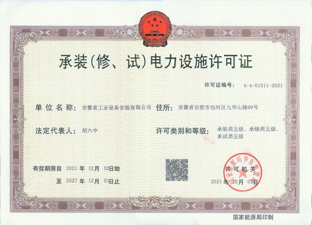 近日,安徽安裝公司申報的承裝(修、試)電力設施許可證資質成功獲批。