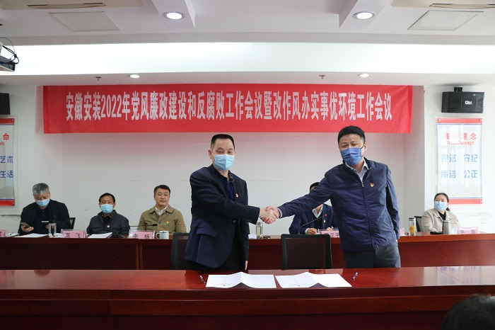 會上傳達學習了習近平總書記在十九屆中央紀委六次全會上的重要講話精神、省紀委十一屆二次全會精神、全省改進工作作風為民辦實事為企優環境大會精神以及集團黨風廉政建設和反腐敗工作暨改作風辦實事優環境工作會議精神,宣讀了《安徽安裝公司改作風、辦實事、優環境工作實施意見》,公司黨委與所屬各黨支部簽訂了《黨風廉政建設責任書》,公司中層管理人員簽訂了《廉潔自律承諾書》。會議以現場加視頻形式召開,公司機關各部門正副職、合肥地區分公司領導班子成員,外地分公司分別在主、分會場參加會議。