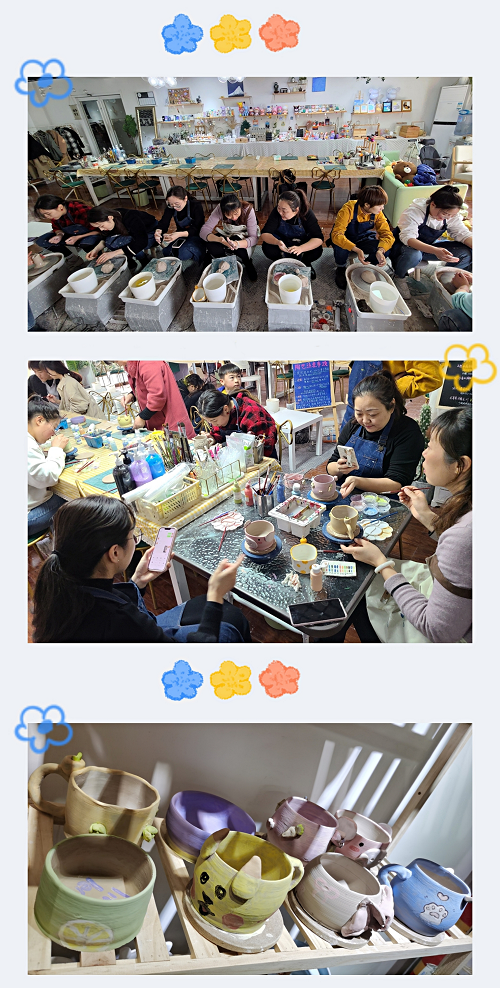 活動(dòng)開(kāi)始,大家一起參觀了各種各樣、富有特色的陶藝作品,使大家對(duì)“陶藝”產(chǎn)生了濃厚的興趣。首先陶藝?yán)蠋煘榇蠹抑v解了制作過(guò)程以及注意事項(xiàng),并演示了捏壓、拉胚、修胚、上色等制作陶藝的步驟。在老師的精心指導(dǎo)下,大家先從一塊無(wú)固定形狀的土坯泥塊開(kāi)始,進(jìn)行練泥、拉坯,只見(jiàn)放置在轉(zhuǎn)盤中心的泥團(tuán),隨手法的屈伸收放,不同形狀的杯子在大家的手中被創(chuàng)造出來(lái)。隨后大家用專用顏料在陶體上畫(huà)上自己心儀的圖案和彩繪,不一會(huì)兒,陶泥像被賦予了新的生命一般,一朵朵花,一只只小動(dòng)物都躍然于陶藝素胚杯上,原本樸素的陶藝作品頓時(shí)活靈活現(xiàn)。最終一件件獨(dú)具匠心的陶藝作品,展現(xiàn)在大家面前,大家都十分期待早日拿到經(jīng)過(guò)上釉和燒制后親手制作的作品。
