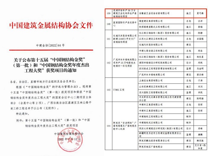 安徽安裝公司蕪湖宇培年產(chǎn)50萬方建筑工業(yè)化構(gòu)件生產(chǎn)基地鋼結(jié)構(gòu)項目榮獲“中國鋼結(jié)構(gòu)金獎”