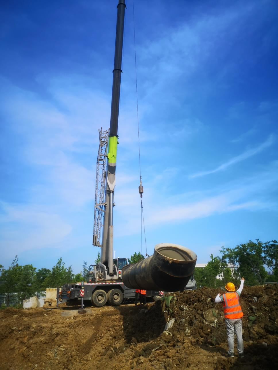 圖為市政分公司四水廠項目80噸吊車正在對DN1800螺旋鋼管進行吊裝