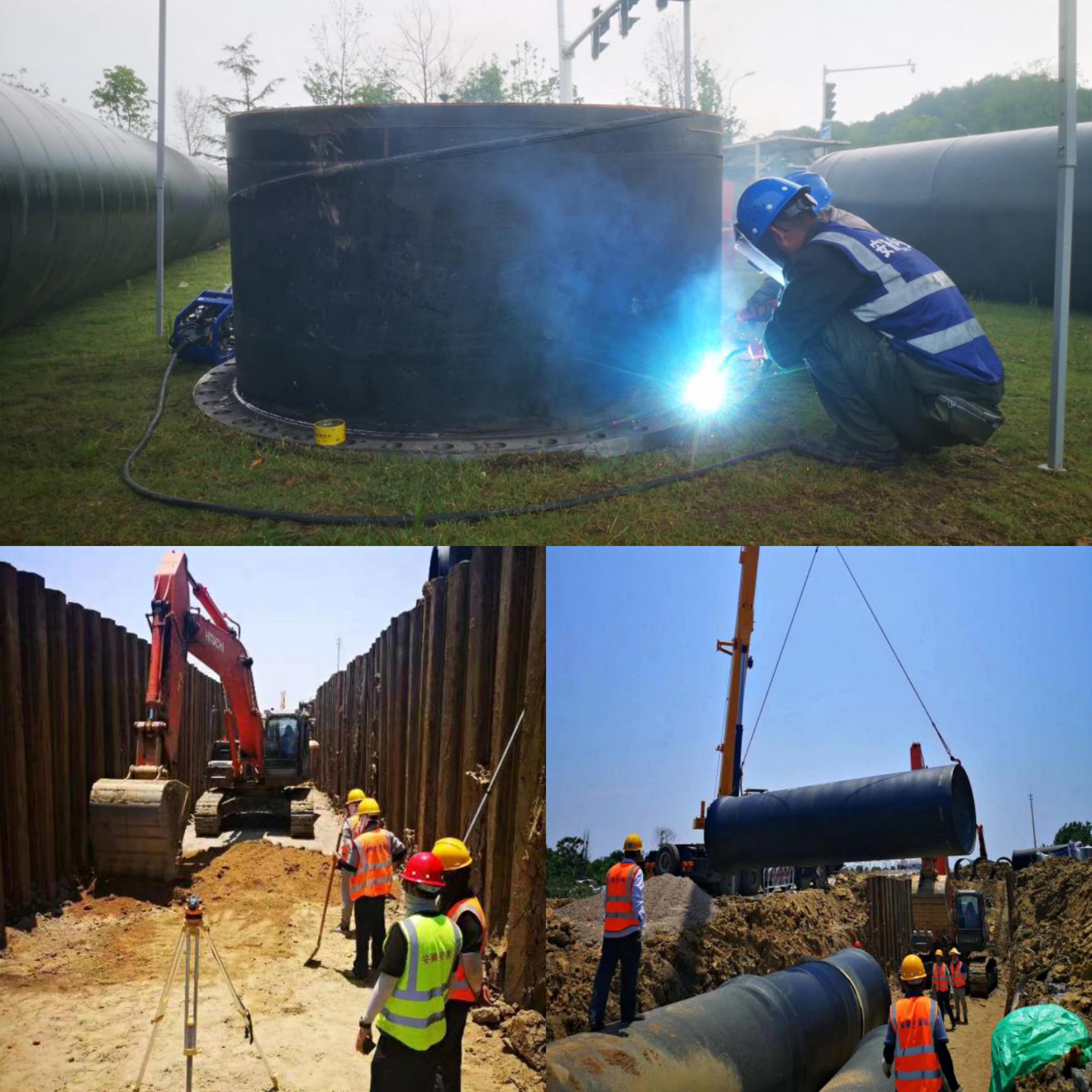 圖為市政分公司四水廠DN1800、DN1400供水管道遷建工程管網項目正在緊張施工。1.焊花綻放、夏季中最美的煙花,2名焊工,正在對DN1800鋼管與法蘭進行焊接(上圖)2. 50噸吊車正在對DN1800球墨鑄鐵管進行吊裝(右下圖);3. 槽底換填、鋪砂墊層(左下圖)