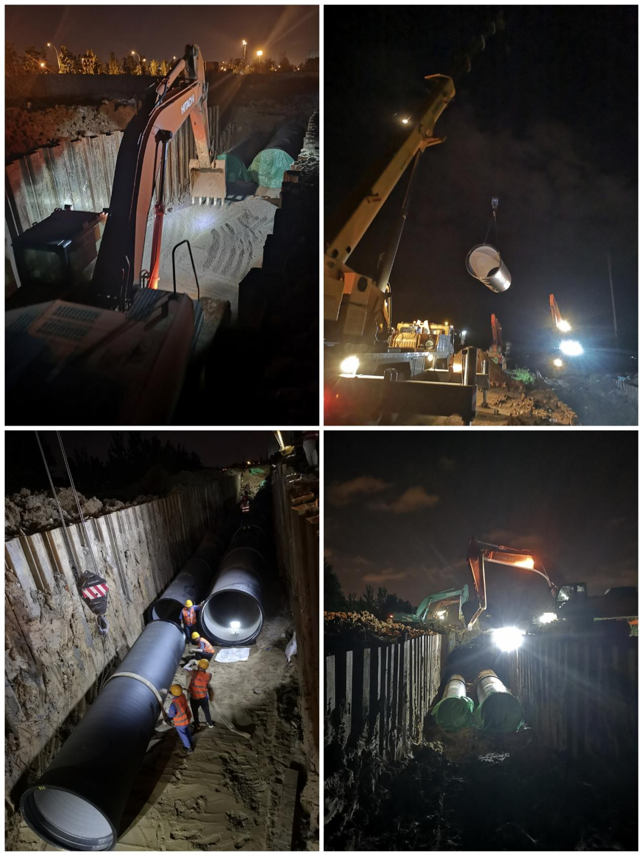 圖為市政分公司市政分公司四水廠DN1800、DN1400供水管道遷建工程管網項目晚間施工。1.鋪設砂墊層。挖掘機對溝槽底部進行換填(左上圖);2.起重吊裝。50噸汽車吊將DN1800球墨鑄鐵管吊放至溝槽內(右上圖);3.球墨鑄鐵管安裝。管工正在校正管道軸線,進行管道安裝(左下圖);4.溝槽回填。球墨鑄鐵管安裝完成后,挖掘機進行管道覆土回填(右下圖