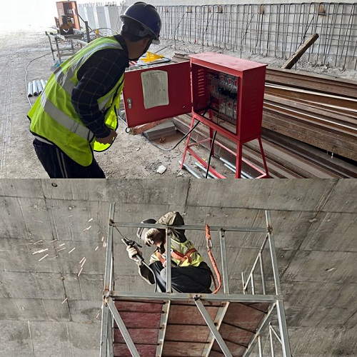 圖為花園大道道路工程項目現場臨時用電檢查及登高架焊接場景