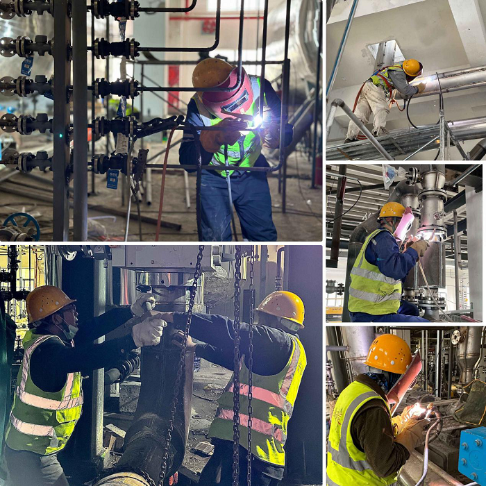 面對建設單位準備在5月下旬進行試生產的目標任務,車間內新增管線是否能夠按時完成就成為確保試生產順利進行的最大難題。為此,項目部精心組織、加強協調,認真部署,通過多次召開碰頭會最終達成最優施工進度方案,做到明確每日進度內容,合理安排施工人員,積極做好施工現場各項安全防護工作,在保證原有工程量的基礎上,對新增管線進行科學分解,新增突擊作業隊,采用“5+2”“白加黑”,多個小組多工作面同時施工的方法,開足馬力快速推進,從而大大提高了施工速度,提升了工作效率。