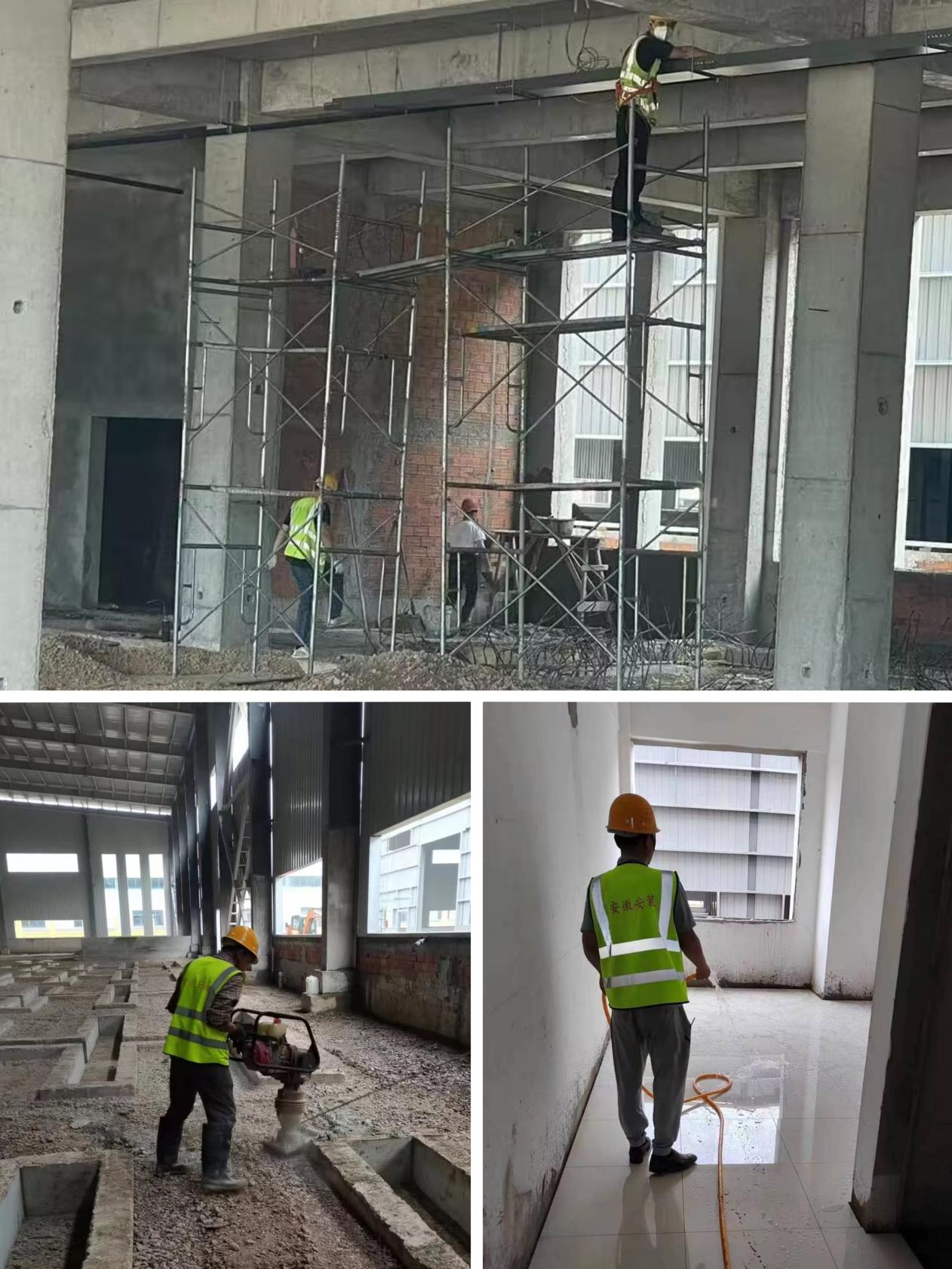 肥西安信立士項目現(xiàn)場正在進行地基夯實、橋架安裝、瓷磚灑水養(yǎng)護