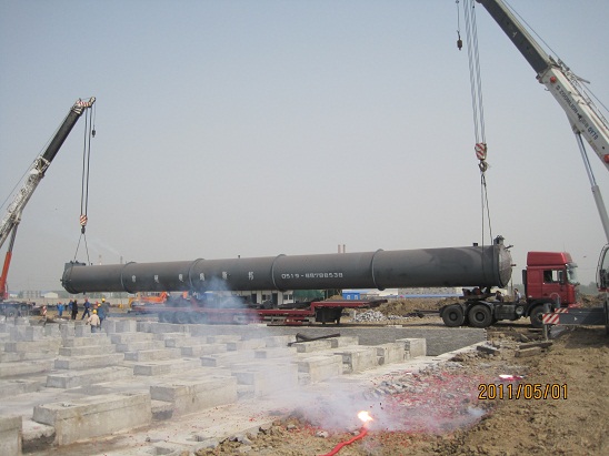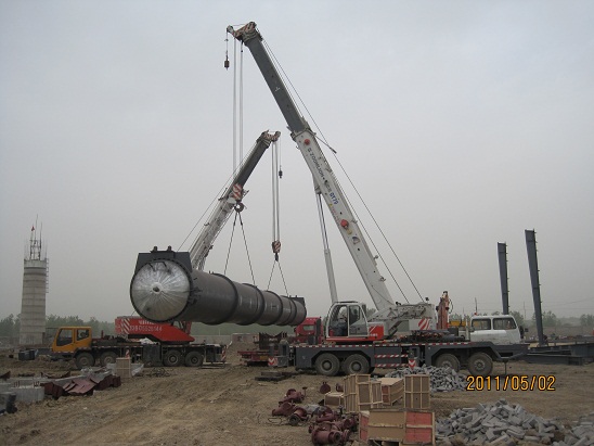 5月1日上午9時許,隨著一陣鞭炮聲響徹鳳陽僑裕新型建材有限公司施工工地,蚌埠分公司承建的鳳陽僑裕8臺蒸壓斧吊裝工作由此拉開了序幕。待安裝蒸壓斧單臺直徑2米、長32米、重約35噸。9點(diǎn)15分,隨著一聲號令,兩臺50T和70T吊車緩緩收鉤,在現(xiàn)場 “起臂、轉(zhuǎn)臂、扒臂、起鉤、落鉤”等手勢的正確指揮下,第一臺蒸壓斧就象一條巨龍騰空而起,9點(diǎn)25分穩(wěn)穩(wěn)地落在預(yù)定的位置上,至5月2日11時最后兩臺設(shè)備就位,順利完成了全部吊裝任務(wù)。本次吊裝作業(yè)由于項目部安排得當(dāng)、組織有力、協(xié)調(diào)到位,整個吊裝作業(yè)安全規(guī)范,現(xiàn)場施工井然有序,安徽省安的專業(yè)施工能力再次得到檢驗!