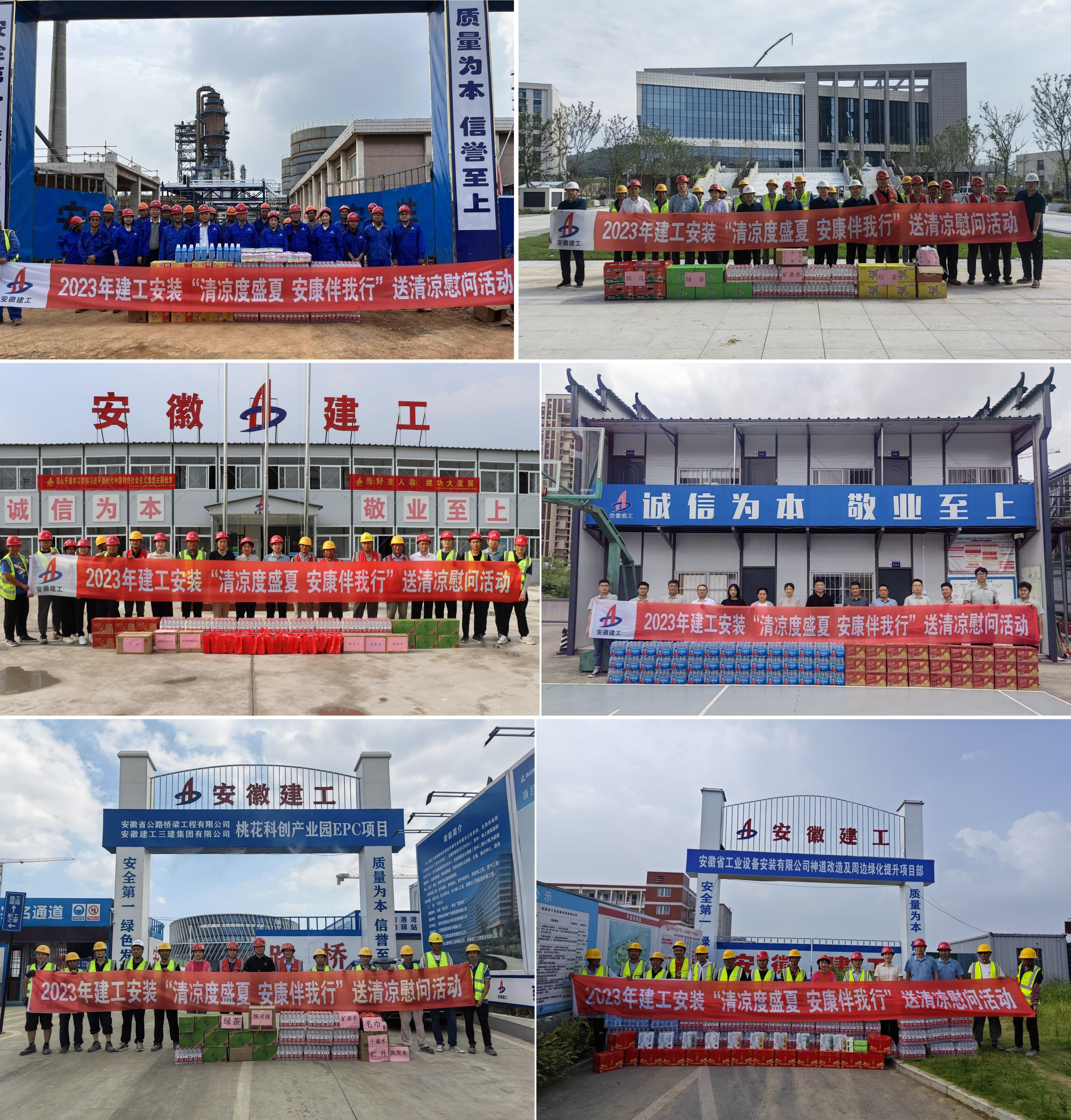 此次慰問先后來到中石化安慶分公司循環水排污水治理項目、蚌埠市公安局“三個基地”項目、阜南縣城南污水處理廠改擴建及配套管網工程(廠區工程)、合肥市高鐵路初中及高鐵路小學項目、桃花科創產業園EPC項目、神道改造含停車場及周邊綠化提升項目等施工一線,給大家送去西瓜、礦泉水、王老吉、仁丹等防暑降溫物品及夏日清涼洗護用品,為高溫下堅守工作崗位的一線職工送去清涼和關懷。