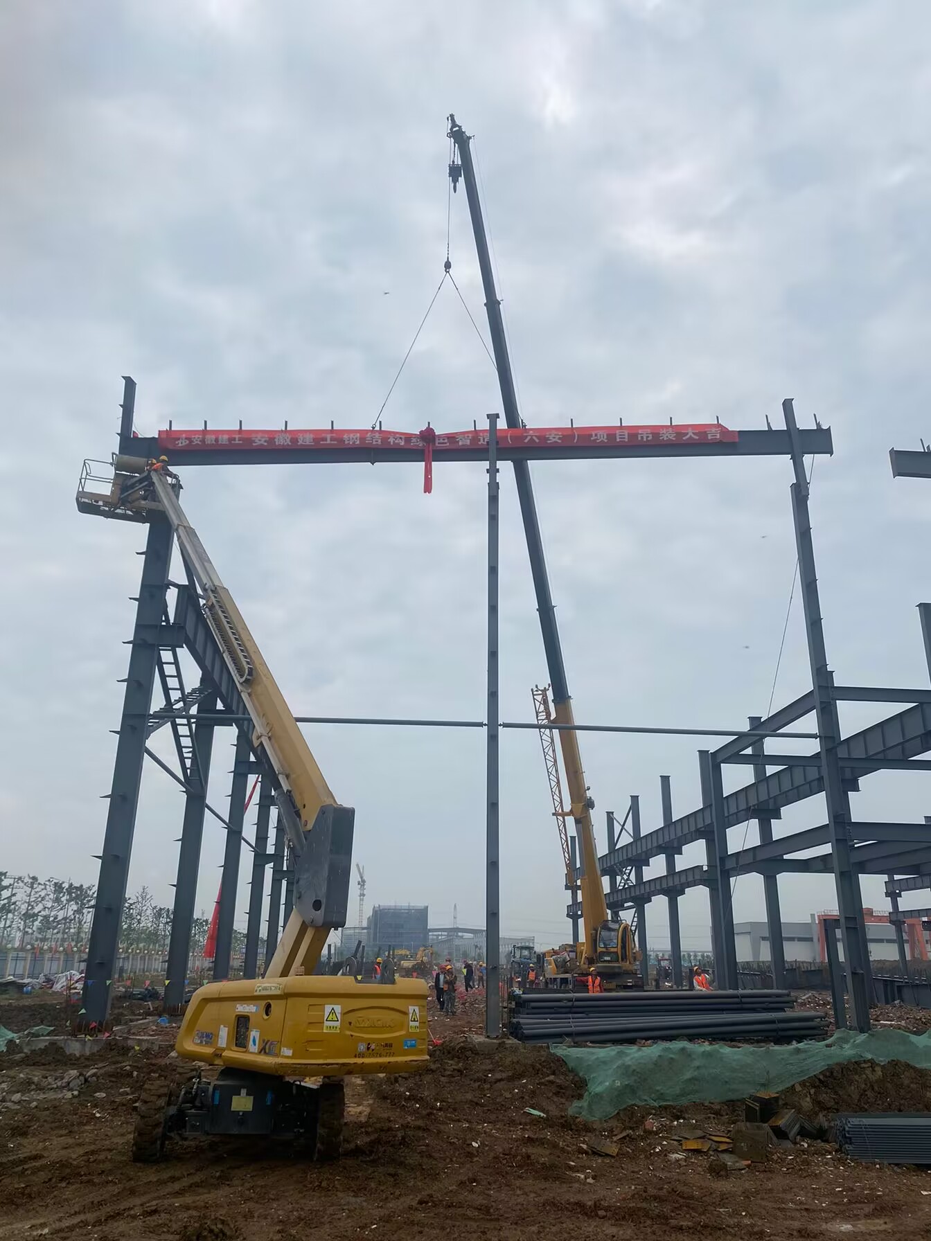 5月1日上午8點18分,建工安裝合肥分公司安徽建工鋼結構綠色智造(六安)項目順利開始“大跨度屋面梁吊裝作業”。