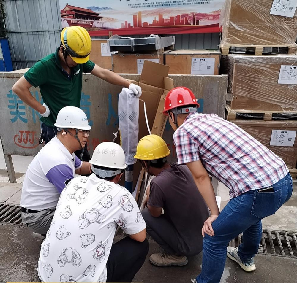 安徽大學綠色產業創新基地項目現場安裝人員正在進行電梯開箱檢驗