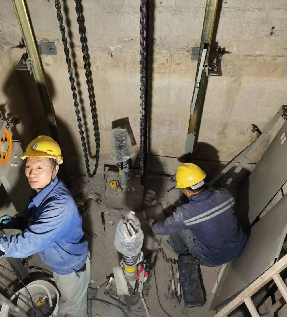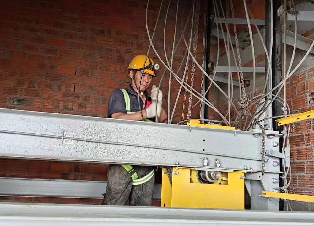 長三角一體化中新蘇滁高新區高端智能制造產研基地項目現場安裝人員正在收緊鋼絲繩、調整電梯緩沖距離