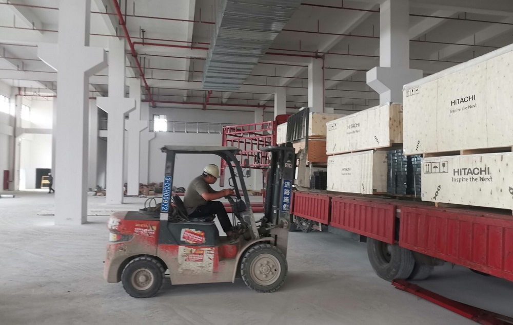 臨港科創園項目現場安裝人員正在進行電梯卸貨