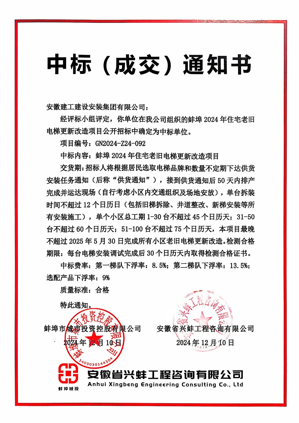 12月10日,建工安裝電梯分公司成功收到蚌埠2024年住宅老舊電梯更新改造項(xiàng)目中標(biāo)通知書!