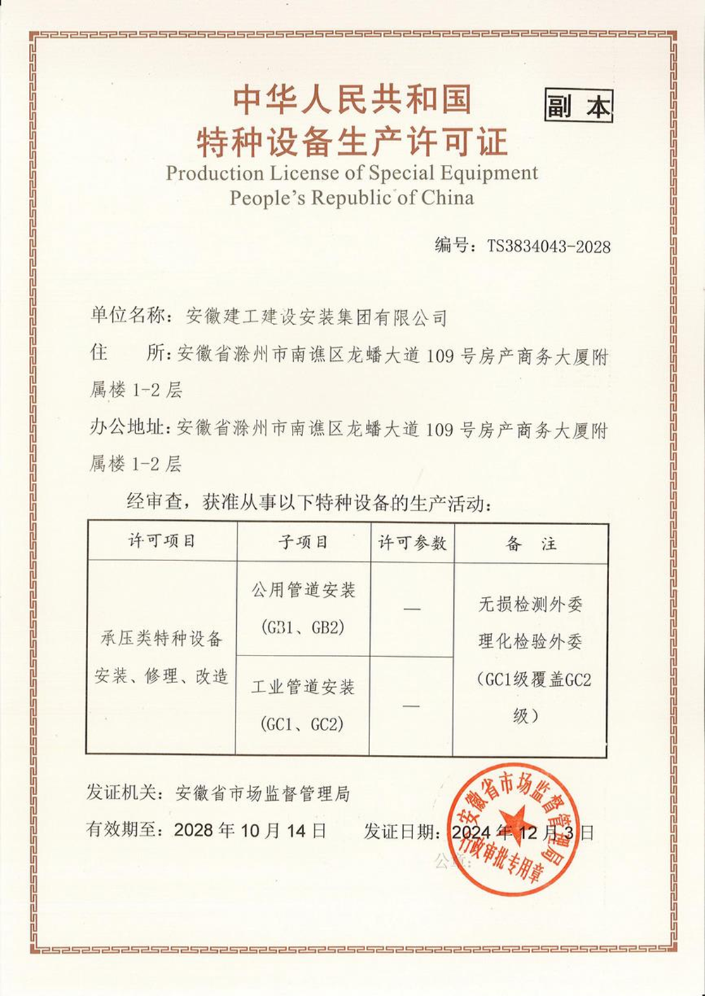 近日,建工安裝“承壓類特種設備安裝、修理、改造—壓力管道(GB1、GB2)、(GC1、GC2)”延續換證工作順利通過中國工業氣體工業協會、安徽省特種設備檢測院等各方的評審核查,現已取得安徽省市場監督管理局頒發的新證,為公司相關業務的開展奠定了良好基礎。