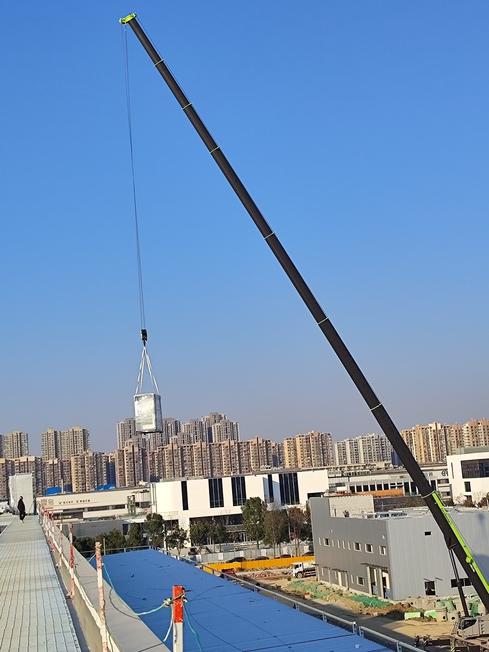 近日,車間一大型設(shè)備組合式空調(diào)陸續(xù)到貨,項(xiàng)目部有序開展組合式空調(diào)現(xiàn)場吊裝工作。為了確保吊裝工作的順利進(jìn)行,項(xiàng)目部多次召開方案實(shí)施推進(jìn)會(huì),根據(jù)設(shè)備到場計(jì)劃,結(jié)合天氣情況、進(jìn)場路線、現(xiàn)場站位、部件起吊等反復(fù)優(yōu)化吊裝方案。梳理工作清單、制定工作任務(wù)、責(zé)任落實(shí)到人。同時(shí)采用現(xiàn)場拉設(shè)警戒區(qū)域、現(xiàn)場作業(yè)交底、試吊、全程看護(hù)作業(yè)等方式,保障現(xiàn)場吊裝作業(yè)安全進(jìn)行。