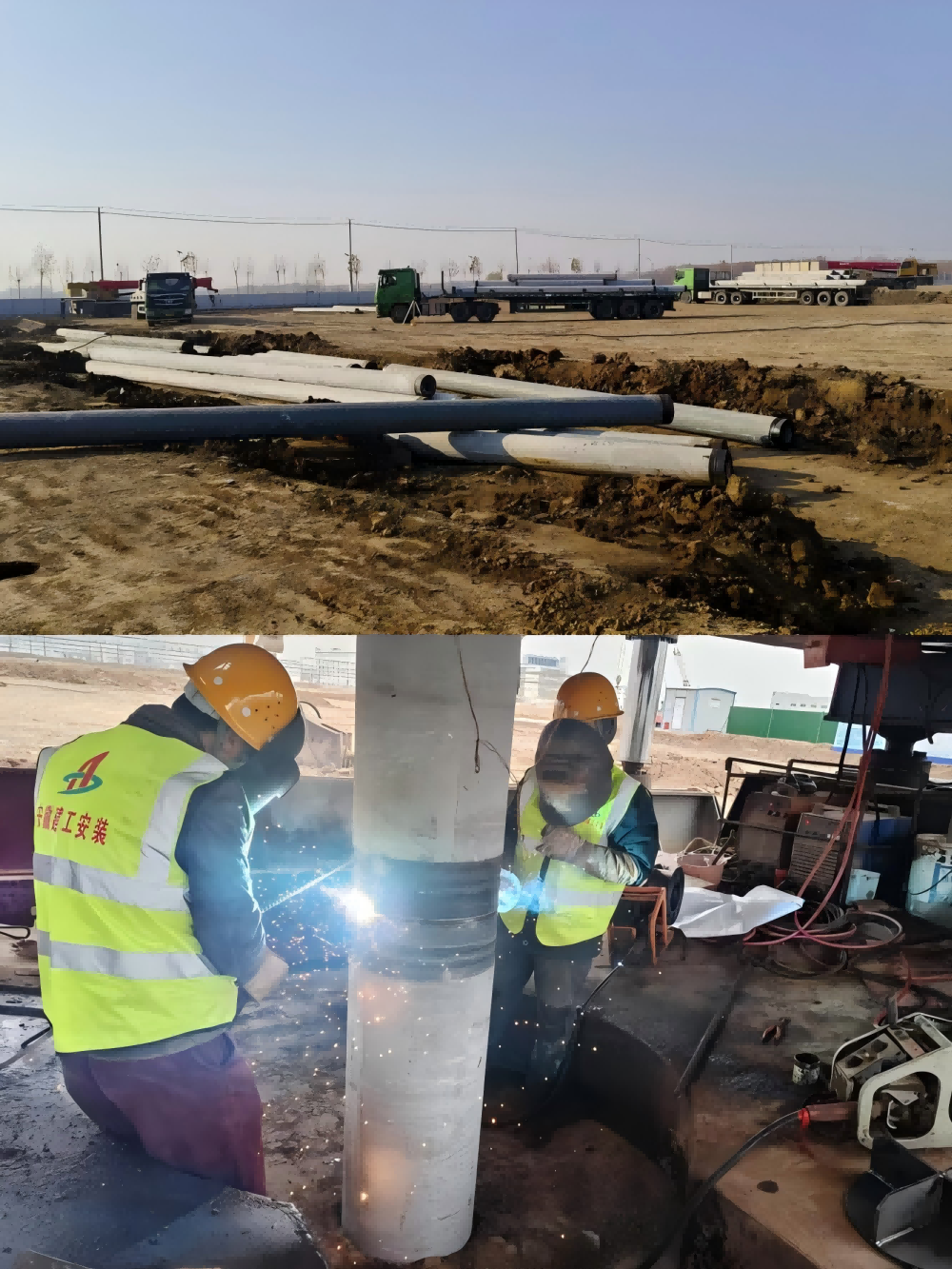 圖為明光涂料、防水材料及配套原料等產品智能化基地一期項目管樁原材料進場、焊接管樁