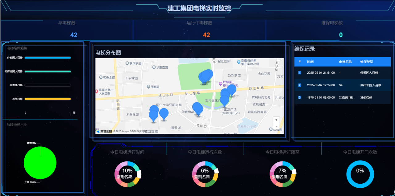 新搭建的電梯管理模塊構建起高效的數據互通橋梁,不僅能夠實時獲取已上線電梯編號、電梯設備名稱等各項基礎數據,還能精準監測電梯運行時間、運行距離、運行次數、開門次數等動態數據信息。該系統可全程追蹤電梯召修記錄,詳細記錄召修維保上報時間、電梯維保人員到場時間,以及電梯故障處理過程、因故障困人后的解救時間等信息。這些數據的全面整合與實時呈現,能夠全方位、立體化掌握每臺電梯的運行狀態及故障率,增強了電梯運行的安全性和可靠性,有效提升電梯維保效率。