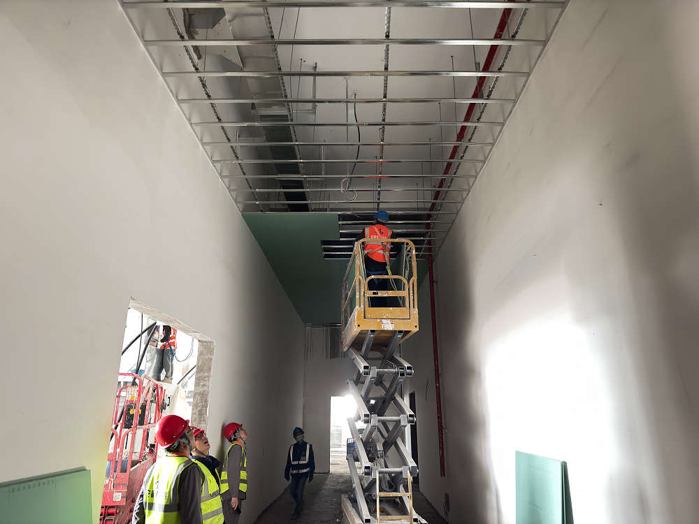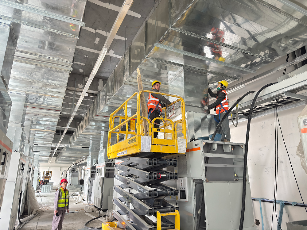 青海高原,氣候惡劣,環境艱苦,高寒缺氧,但這些困難并沒有阻擋項目部全體成員奮斗的步伐。施工現場,機器轟鳴聲此起彼伏,工人們頭戴安全帽,身系安全繩,操作著各種設備,熟練地進行著防水卷材敷設、吊頂板安裝、鋼筋綁扎、外墻抹灰、風管安裝等作業,每個環節都緊張有序,環環相扣。項目管理人員穿梭在各個施工點,緊盯現場安全與質量,及時協調解決施工中遇到的問題,他們全身心地投入到工作中,用專業的素養和嚴謹的態度為項目建設保駕護航。