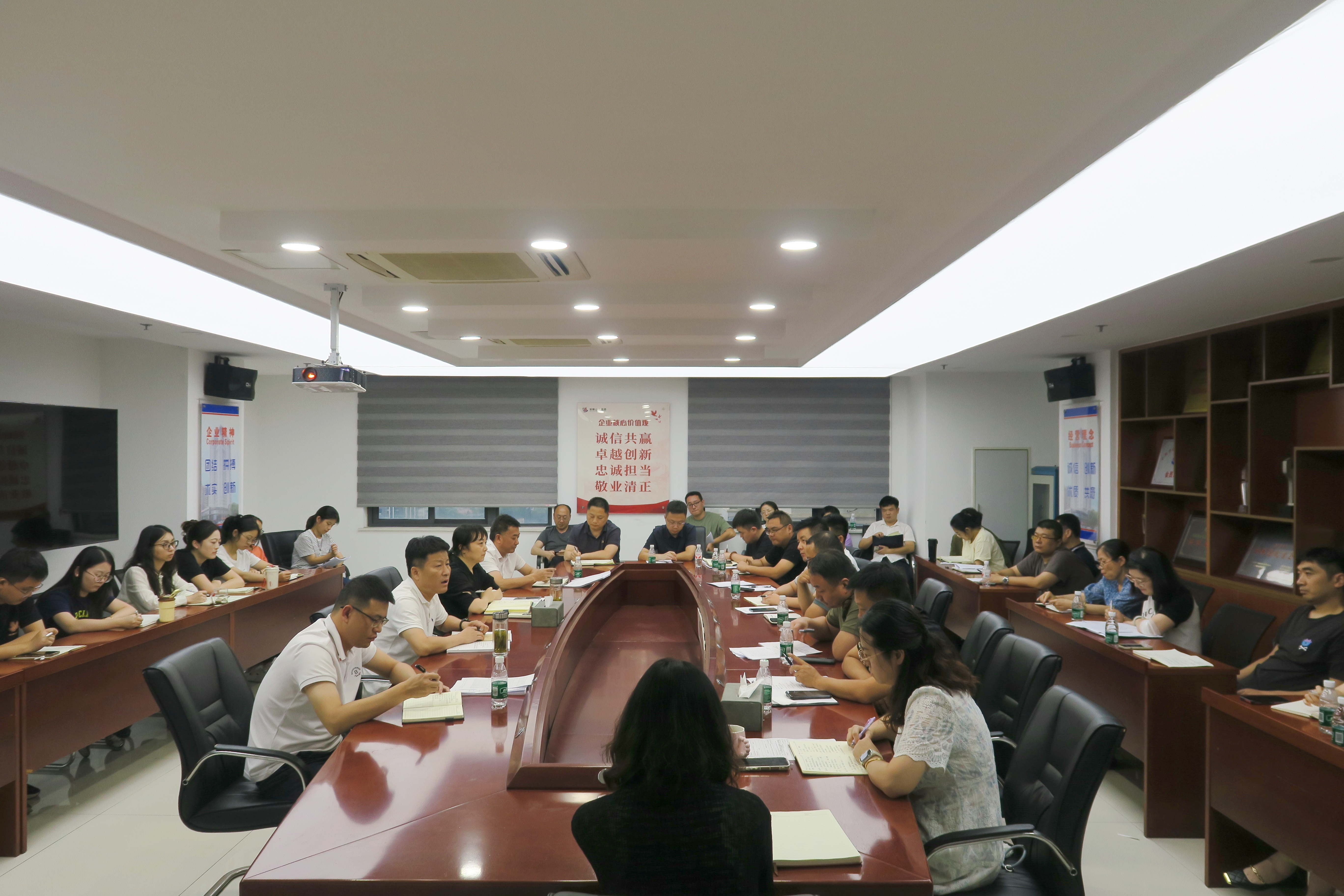 7月31日下午,建工安裝建筑公司組織召開7月生產經營調度會。建筑公司領導班子、各部門負責人、各項目主要負責人、機關全體員工參加會議。